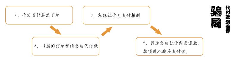 也会让你提交一堆资料,其中包含一个卖家另外的支付宝,忽悠创建新订单替换原来被差评的订单(神乎其神,牛X),需要您代付(咋一听还挺符合情理,一旦代付你可就掉入其陷阱啦),...接着忽悠你无需物流点发货(发货买家申请退款款项可就进入骗子的口袋啦!),一笔交易的报酬怎么满足其胃口,接着忽悠,多代付几笔,美其名曰成功率更高。